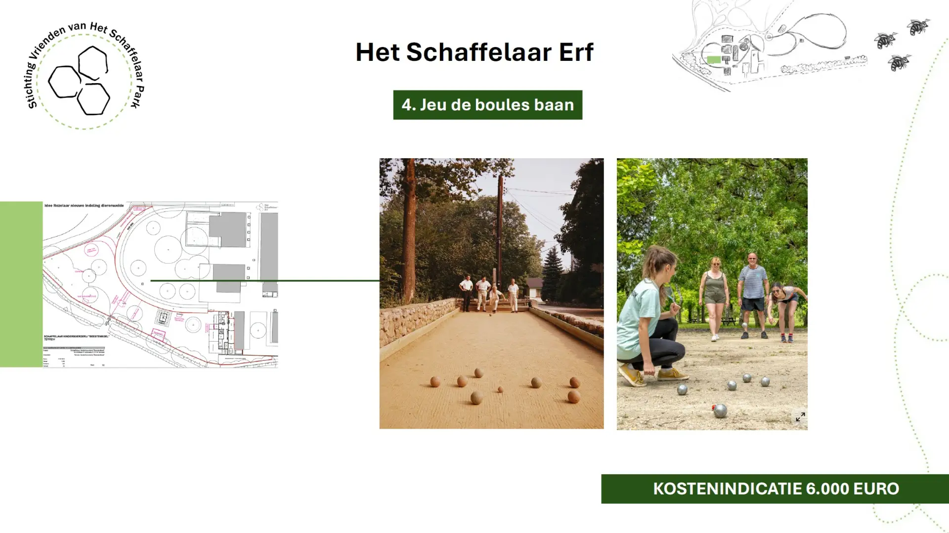 De stichting zet zich in voor de aanleg van een jeu de boulesbaan: een laagdrempelige plek waar jong en oud elkaar kan ontmoeten, bewegen en samen plezier maken.